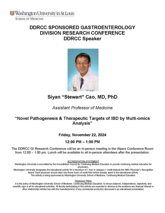 DDRCC Sponsored Gastroenterology Division Research Conference Nov 22, 2024 12:00 p.m.-1:00 p.m. Add to: Google Calendar | Outlook | iCal File