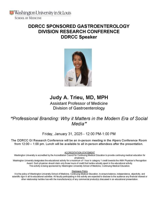 DDRCC Sponsored Gastroenterology Division Research Conference Jan 31, 2025 12:00 p.m.-1:00 p.m. Conferences Alpers Conference Room Add to: Google Calendar | Outlook | iCal File