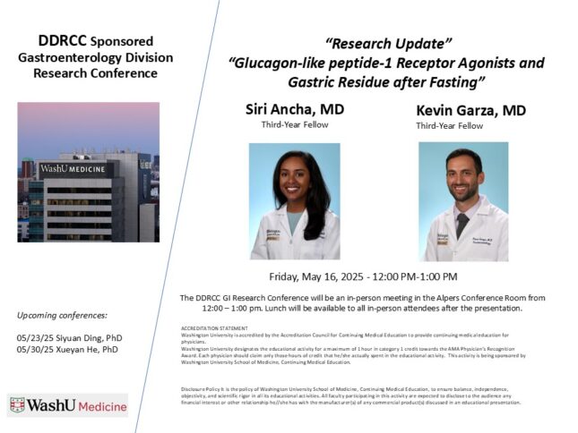 DDRCC SPONSORED GASTROENTEROLOGY DIVISION RESEARCH CONFERENCE May 16, 2025 12:00 p.m.-1:00 p.m. Conferences Alpers Conference Room Add to: Google Calendar | Outlook | iCal File