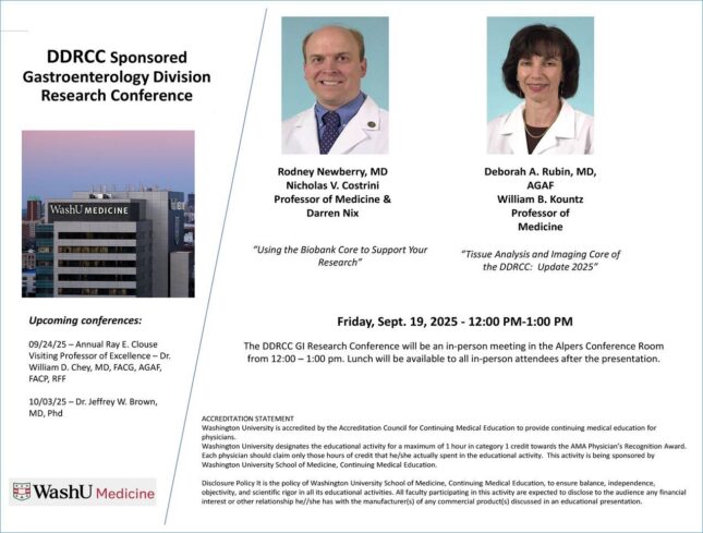 DDRCC Sponsored Gastroenterology Division Research Conference Sep 19, 2025 12:00 p.m.-1:00 p.m. Conferences Alpers Conference Room Add to: Google Calendar | Outlook | iCal File