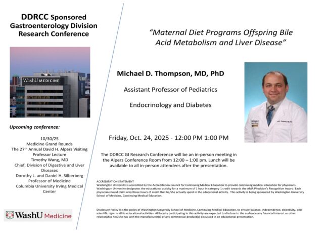 DDRCC Sponsored Gastroenterology Division Research Conference Oct 24, 2025 12:00 a.m.-1:00 a.m. Conferences Alpers Conference Room Add to: Google Calendar | Outlook | iCal File