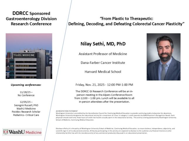 DDRCC Sponsored Gastroenterology Division Research Conference Nov 21, 2025 12:00 p.m.-1:00 p.m. Conferences Alpers Conference Room Add to: Google Calendar | Outlook | iCal File