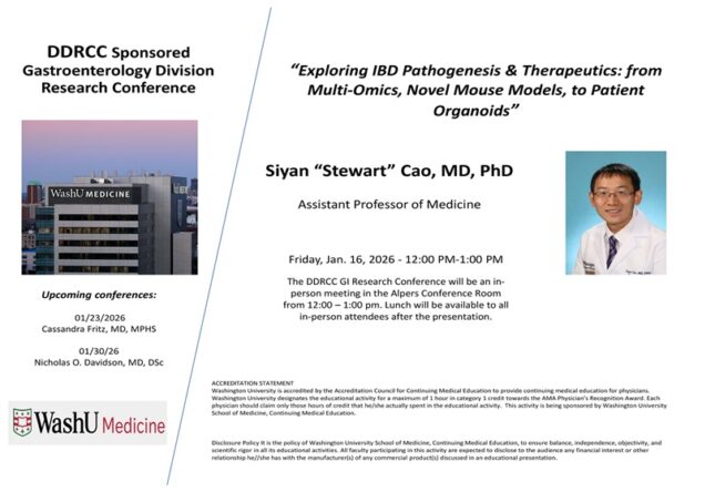 DDRCC Sponsored Gastroenterology Division Research Conference Jan 16, 2026 12:00 p.m.-1:00 p.m. Conferences Alpers Conference Room Add to: Google Calendar | Outlook | iCal File