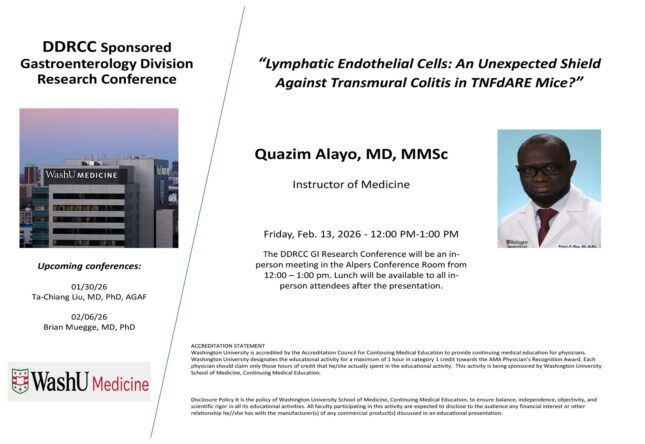 DDRCC Sponsored Gastroenterology Division Research Conference Feb 13, 2026 12:00 p.m.-1:00 p.m. Conferences Alpers Conference Room Add to: Google Calendar | Outlook | iCal File