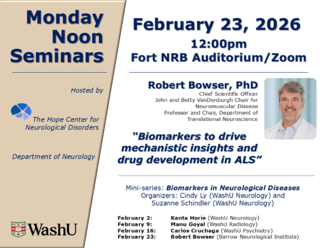 The Monday Noon Seminars are co-hosted by the WashU Hope Center for Neurological Disorders and Department of Neurology.