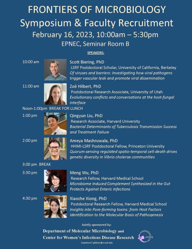 Frontiers of Microbiology Symposium & Faculty Recruitment Event Feb 16, 2023 10:00 a.m.-5:30 p.m. Faculty Candidate Seminar | Seminars / Lectures Eric P. Newman Education Center, Seminar Room B, 320 S Euclid Ave., St. Louis, Missouri 63110 Add to: Google Calendar | Outlook | iCal File Department of Molecular Microbiology and the Center for Women's Infectious Disease Research